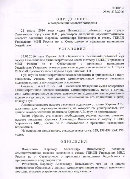 Рис. 6 Пример определения суда о возврате искового заявления