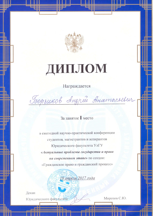 Равным образом осуществляю практику в плоскости ГПК и КАС по спорам имущественного характера (наследственные дела, раздел имущества супругов, взыскание убытков, деликты) и в плоскости оспаривании решений, действий (бездействия) органов государственной власти. Отдельный сектор работы - представление интересов потерпевших по уголовным делам, восстановление нарушенных имущественных интересов. Осуществляю абонентское обслуживание юридических лиц и ИП в текущей хозяйственной деятельности в рамках аутсорса. Призер и победитель ряда профессиональных конкурсов в юриспруденции: - Юрист года 2023 года в номинации "Лучший молодой юрист" по версии Ассоциации Юристов России (УРОО). - Лучший молодой адвокат 2022 года (АПУО), 1 место - Лучший молодой адвокат 2021 года (АПУО), 1 место - Лучший молодой адвокат 2020 года (АПУО), 1 место - Лучший молодой адвокат 2019 года (АПУО), 3 место.